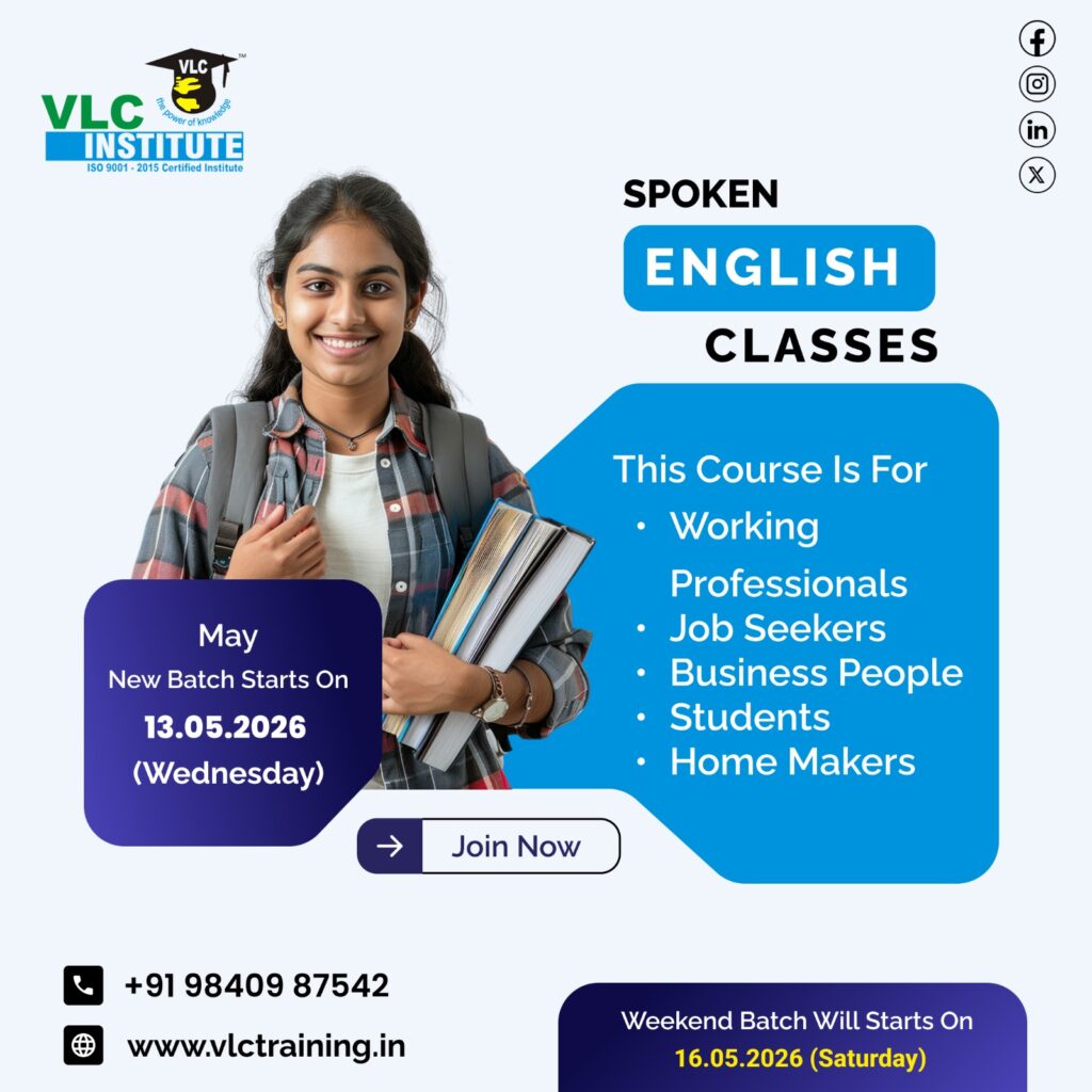 20 Apr English Up Coming English Classes – Spoken English In Tambaram Chennai VLC Institute Tambaram Spoken English Classes, We kindly inform you that the new batches start onMAY – 2026Timings availableWeek days – 13.05.2026 ( Wednesday )07 to 09 am, 10 to 12 noon,05 to 07 pm, 07 to 09 pm.Weekend – 16.05.2026 (Saturday)Saturday – 05 to 08 pm,Sunday – 8.30 to 11.30 am.Contact : 9840987542 / 9363987542. Contact Us